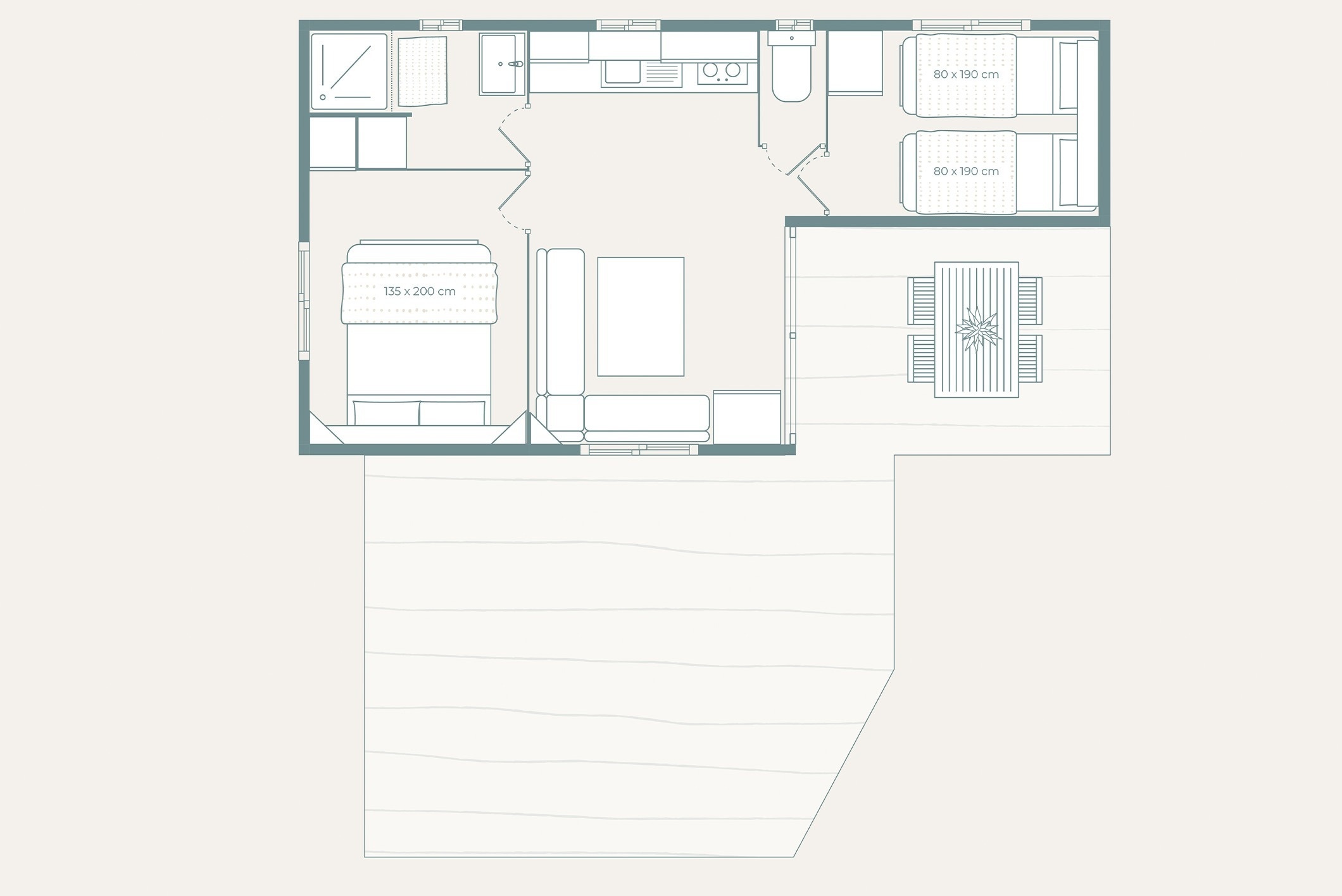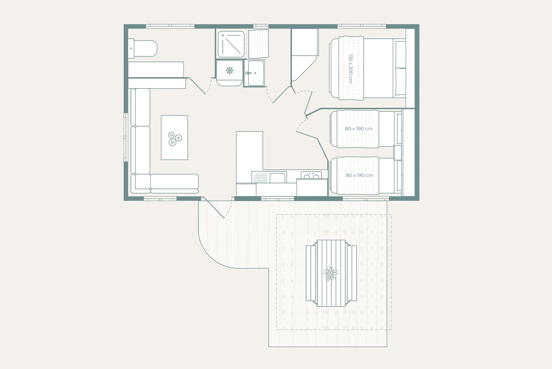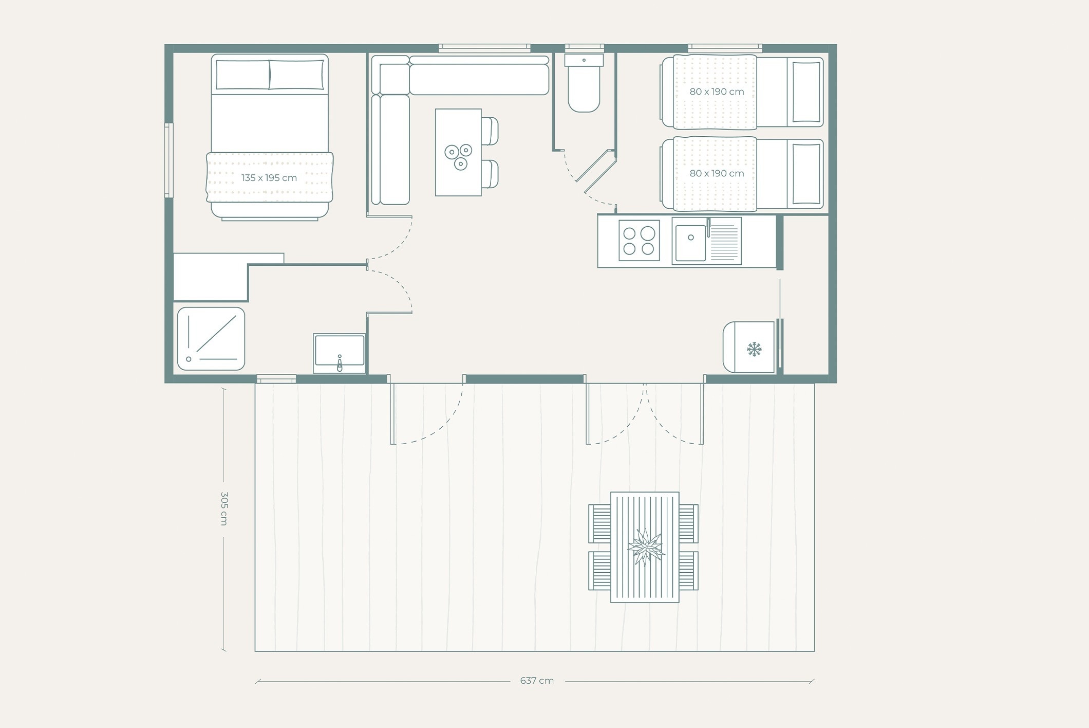 Aquest bungalou, ideal per a 6 persones, combina confort i natura de manera única. Compte amb tres habitacions: una amb llit doble i dues amb llits individuals. A més, disposa d´aire condicionat, bany privat i una cuina completament equipada. A l'exterior, podreu gaudir d'una terrassa privada, perfecta per relaxar-vos a l'aire lliure i compartir moments especials amb els vostres.