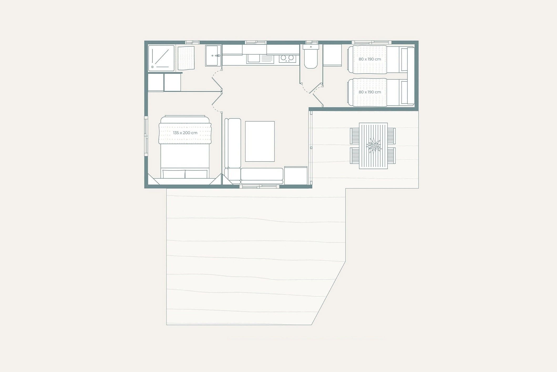 This bungalow, ideal for 6 people, uniquely combines comfort and nature. It has three bedrooms: one with a double bed and two with single beds. It also features air conditioning, a private bathroom, and a fully equipped kitchen. Outside, you can enjoy a private terrace, perfect for relaxing outdoors and sharing special moments with your loved ones.
