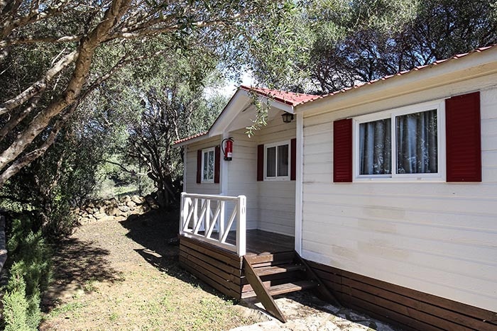 This holiday cottage is perfect for enjoying with family or friends. It has two bedrooms: one with a double bed and the other with two bunk beds and two single beds. It also features a living room with a sofa bed, a fully equipped kitchen, a porch, and an interior patio with a barbecue. Best of all, dogs are welcome, so your pet can enjoy your stay too! There's also a front porch.