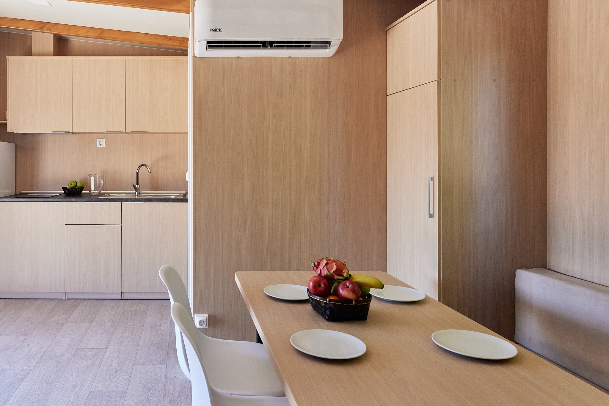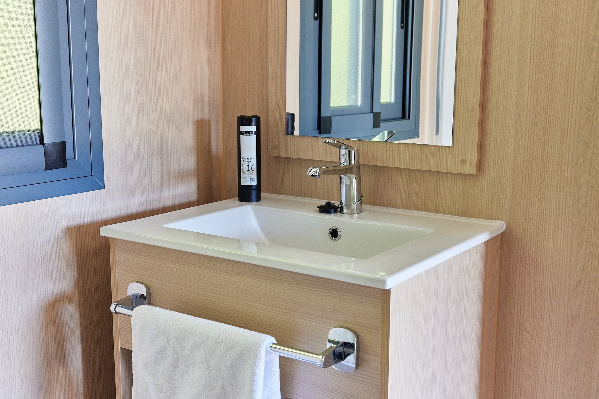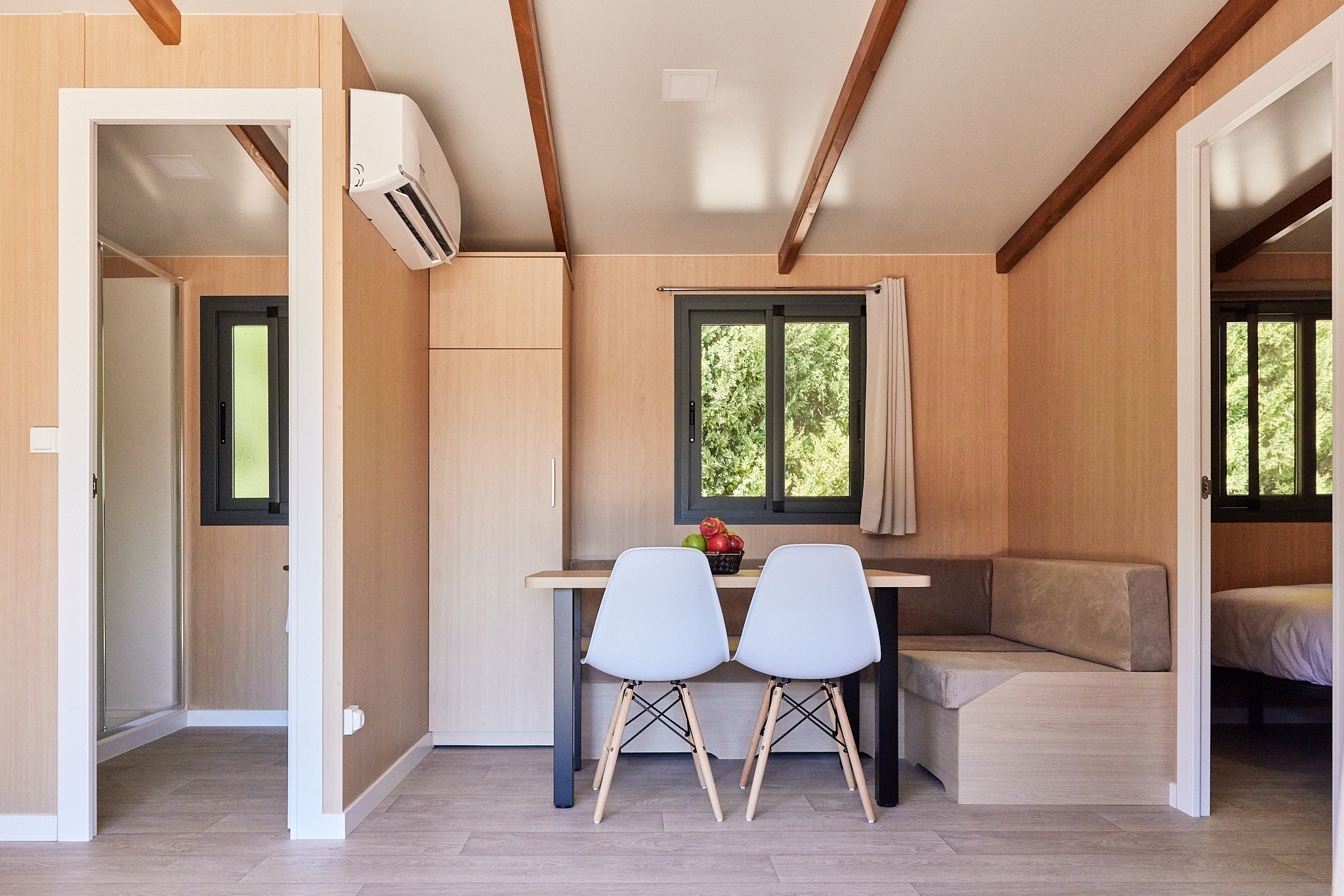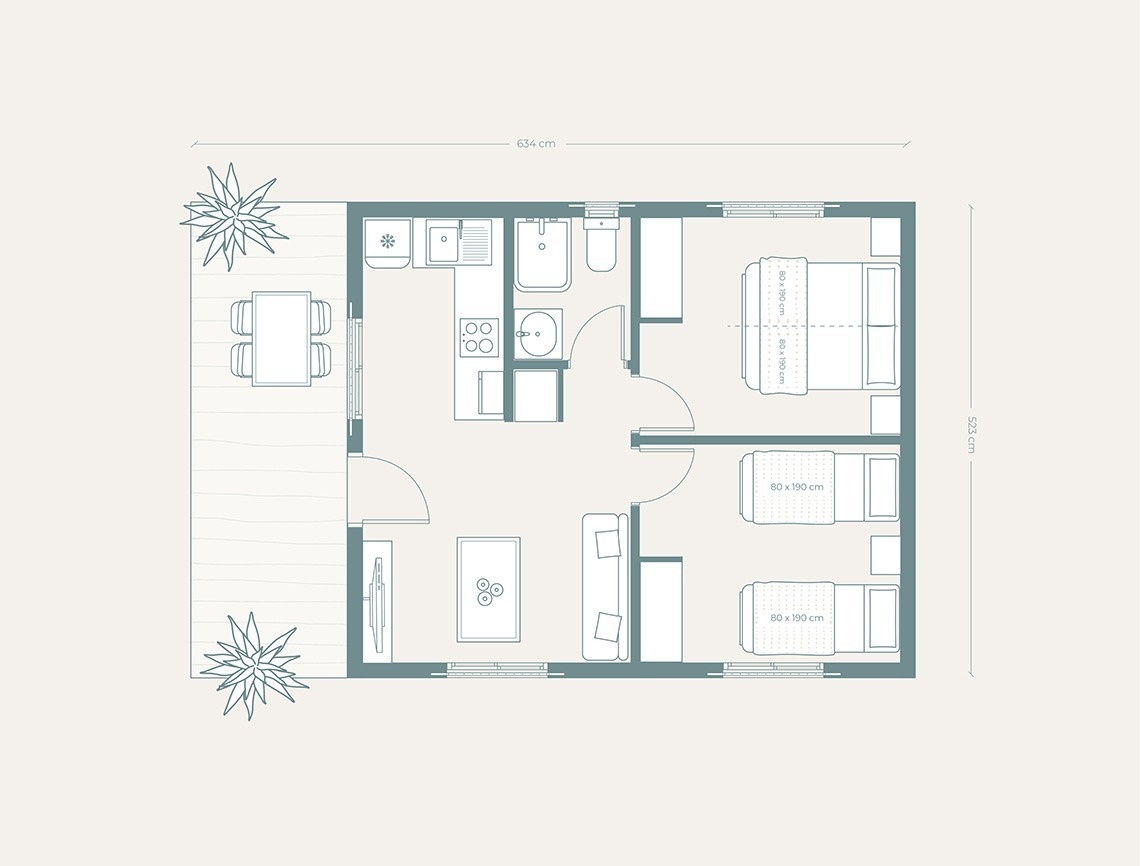Deze moderne bungalow is ontworpen voor gezinnen van maximaal vier personen en biedt alles wat u nodig heeft. De bungalow beschikt over twee slaapkamers: één met een tweepersoonsbed en de andere met twee eenpersoonsbedden. Er is ook een gezellige woonkamer met een bank, een volledig uitgeruste keuken en een eigen badkamer met een douche. Het ruime, gemeubileerde privéterras is perfect om te ontspannen. Huisdieren zijn welkom! Tot de voorzieningen behoren een koelkast, magnetron, servies, broodrooster, airconditioning, verwarming en gratis wifi.